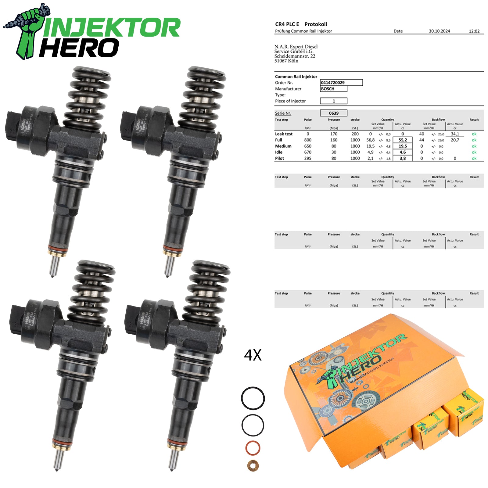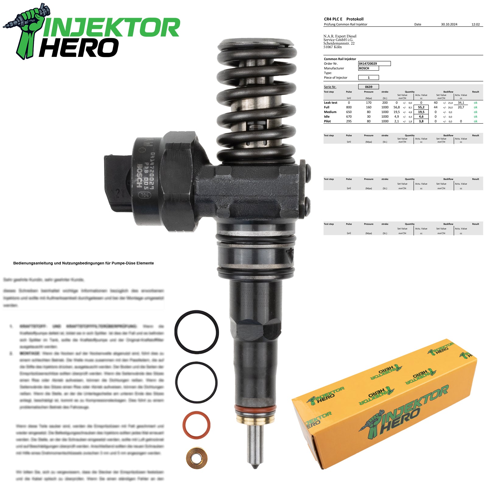 Bei unserer Ware handelt es sich um generalüberholte Injektoren. Für den fachgerechten Einbau des gelieferten Teils sind Sie selbst verantwortlich. Wir empfehlen dringend, die Einbau- und Funktionsprüfung durch qualifiziertes Fachpersonal durchführen zu lassen. Bitte stellen Sie vor dem Einbau sicher, dass das Teil in Maß, Form und Anschluss dem Original entspricht. Bei Abweichungen kontaktieren Sie uns bitte vor der Montage.